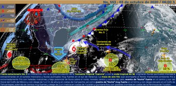 Para hoy, el frente estacionario No. 5 sobre el sureste y oriente del Golfo de México, interaccionará con la amplia circulación de la Tormenta Tropical “Gamma” y con la onda tropical No. 38 al sur de la Península de Yucatán, por lo que se pronostican lluvias puntuales intensas a extraordinarias en el sureste mexicano y lluvias puntuales muy fuertes en el sur de Veracruz.