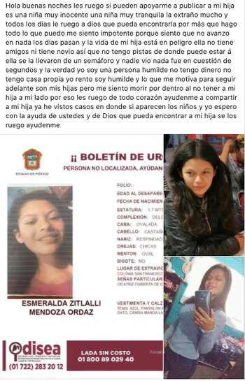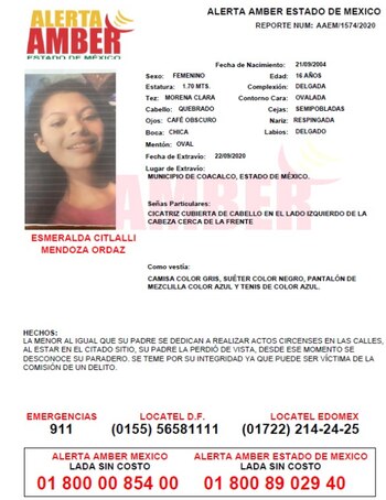 Esmeralda Citlalli Mendoza Ordaz, una adolescente, de 16 años de edad, desapareció en un instante el pasado 22 de septiembre mientras trabajaba con su padre haciendo actos circenses en un crucero de autos en Coacalco.