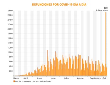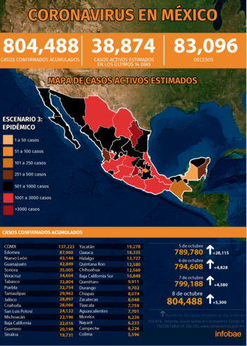 La Secretaría de Salud (SSa) reportó en México registró 804,488 casos de contagios acumulados de coronavirus (COVID-19), de los cuales 38,874 serían los casos activos (presentaron síntomas en los últimos 14 días). Además, desde el inicio de la epidemia, México ha sufrido 83,096 defunciones confirmadas. Lo anterior significa que hubo un incremento de 5,300 contagiados en las últimas 24 horas, así como 370 muertes.