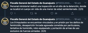 Pese a que se activó la Alerta Amber ese mismo día, ocho días después se dio con la menor asesinad, dio a conocer la Fiscalía General del Estado que el pasado 9 de octubre, derivado de un enfrentamiento de las Fuerzas de Seguridad Pública del Estado y hombres armados se logró asegurar armas, vehículos robados así como la detención de los nueve sujetos integrantes de grupo “Élite”.