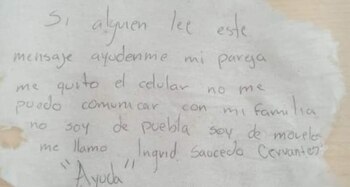 “Si alguien lee este mensaje, ayúdenme, mi pareja me quitó el celular, no me puedo comunicar con mi familia, no soy de Puebla, soy de Morelos, me llamo Ingrid Saucedo Cervantes, AYUDA”, este es el mensaje.