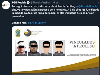 Con base en los elementos de prueba presentados en las respectivas audiencias, la Fiscalía de Puebla logró que el Juez de Control vinculara a proceso a los cuatro hombres por el delito de violencia familiar.