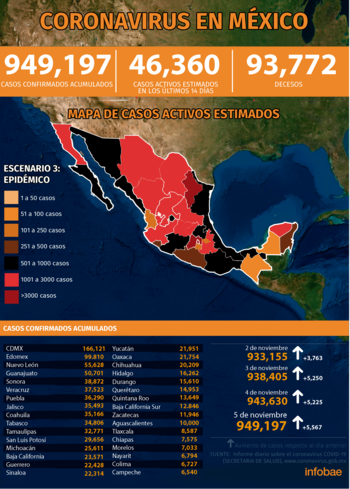En general se han contabilizado 949,197 casos acumulados y 93,772 muertes desde el inicio de la enfermedad el 27 de febrero, mientras que los casos activos se estiman en 46,360, cabe recordar que se consideran casos activos, aquellos casos confirmados por laboratorio y casos por asociación clínica epidemiológica que iniciaron síntomas en los últimos 14 días, permitiendo identificar donde hay mayor actividad viral y por consecuencia aumento en la transmisión.