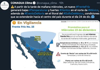 Este miércoles, un nuevo frente frío (No. 23) ingresará por el norte de México y, en interacción con la corriente en chorro, provocará rachas de viento de 50 a 60 km/h en Baja California, Golfo de California, Chihuahua, Coahuila y Nuevo León.