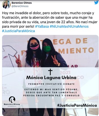 Por su parte, la titular de la coordinación territorial del Consejo Nacional de Fomento Educativo estatal, Berenice Olmos, también condenó el feminicidio de Mónica y se unió a la exigencia de justicia.