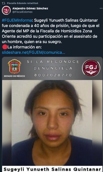 Sugeyli Yunueth Salinas Quintanar fue condenada a 40 años de prisión, luego de que el agente del Ministerio Público de la Fiscalía Especializada de Homicidio de la Zona Oriente de esta Fiscalía General de Justicia Estatal (FGJEM) acreditó su participación en el asesinato de un hombre, quien era su suegro.
