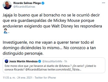 Ante esto, Ricardo Salinas Pliego, quien dirige dicha empresa, ridiculizó la afirmación y se deslindó de tener cualquier relación con el sujeto: “Jajaja lo bueno que al borracho no se le ocurrió decir que era guardaespaldas de Mickey Mouse porque anduvieran exigiendo que Walt Disney les respondiera. Investiguenle, no me vayan a querer tener todo el domingo diciéndoles lo mismo… No conozco a tan distinguido personaje”.