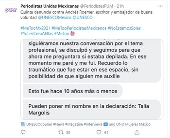 Otra comunicóloga que acusó al escritor de abusar de ella, fue Talía Margulis, quien dijo que el abuso se llevó a cabo hace aproximadamente 10 años, cuando trabajaba con él en La Ciudad de las Ideas.