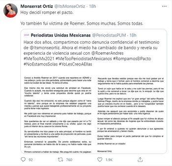 Otra mujer que decidió alzar la voz, fue la periodista Monserrat Ortiz, quien, por medio de la perfil de Twitter Periodistas Unidas Méxicanas. En una publicación el perfil de Twitter, se lee que hace dos años se compartió la denuncia de manera anónima, pero ahora se decidió hacerla pública.