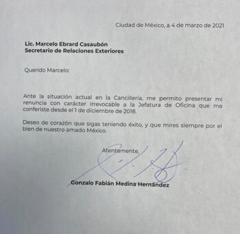 La mañana de este jueves, Fabián Medina Hernández, titular de la jefatura de la oficina del Secretario de Relaciones Exteriores, dependencia que encabeza Marcelo Ebrard, presentó su renuncia en una escueta carta dirigida a su jefe donde no explica los motivos de forma irrevocable y le desea éxito en el futuro.
