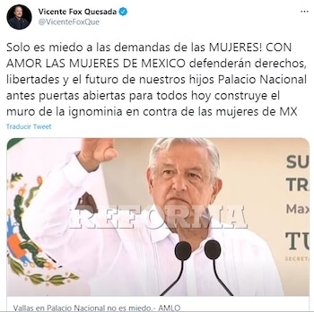 Luego de que el presidente Andrés Manuel López Obrador (AMLO) declarara este sábado que la colocación de vallas metálicas a los alrededores de Palacio Nacional, en donde vive y trabaja, no son por miedo sino para evitar provocaciones y proteger edificios históricos por la marchas que se espera el próximo 8 de marzo, el ex presidente Vicente Fox Quesada dijo que es miedo a las demandas de las mujeres.