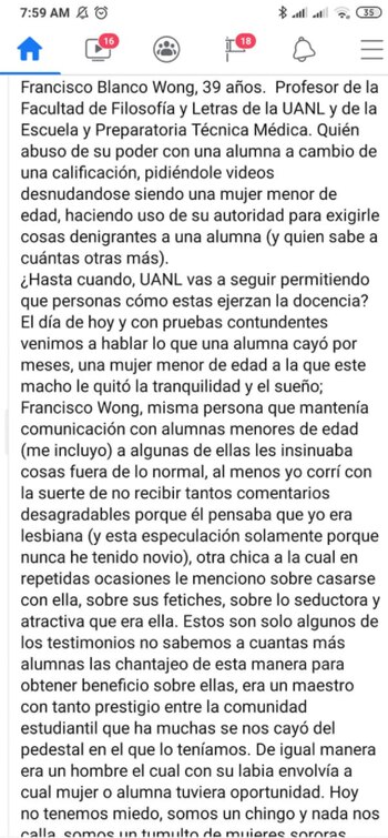 Incluso, alumnas aseguraron que la Universidad encubre a acosadores y también expusieron el caso del profesor de la Facultad de Filosofía y Letras, Francisco Blanco Wong, “quién abuso de su poder con una alumna a cambio de una calificación, pidiéndole videos desnudándose”, contó la usuaria @may_garza18.