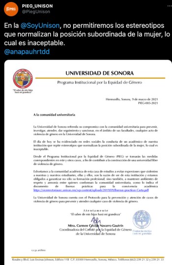 En otro incidente parecido, una alumna de la Universidad de Sonora (Unison) acusó al profesor Abel Baca por mofarse de la lucha feminista cuando se le solicitó permiso para ausentarse de la clase para asistir al movimiento 9M ‘Un Día Sin Mujeres’.