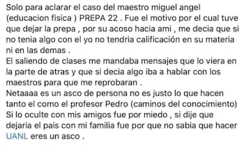 “Pero hoy hace unas horas se reveló del maestro de Cálculo, Abel Baca, de Ciencias Ambientales, su opinión con respecto a este movimiento. No sólo ha sido esa, se ha dicho que ha cometido otras acciones contra nosotras.