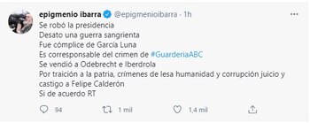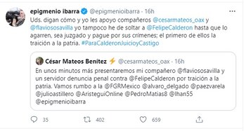 “Uds. digan cómo y yo les apoyo compañeros @cesarmateos_oax y @flaviososavilla yo tampoco he de soltar a @FelipeCalderon hasta que lo agarren, sea juzgado y pague por sus crímenes; el primero de ellos la traición a la patria. #ParaCalderonJuicioyCastigo”, escribió Ibarra.