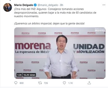 En un video publicado por redes sociales, acompañado del mensaje “¡Otra más del INE! Algunos Consejeros tomando acciones desproporcionadas, quieren bajar a la mala más de 60 candidatos de nuestro movimiento. ¡Queremos un árbitro imparcial, dejen que la gente decida!”, fue que Delgado se pronunció al respecto.
