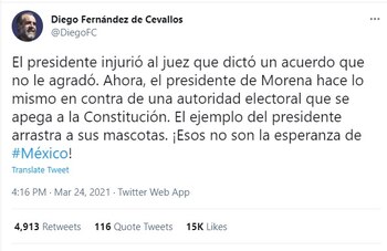 “El presidente injurió al juez que dictó un acuerdo que no le agradó. Ahora, el presidente de Morena hace lo mismo en contra de una autoridad electoral que se apega a la Constitución. El ejemplo del presidente arrastra a sus mascotas. ¡Esos no son la esperanza de #México!” (sic), se lee en el tuit de Fernández de Ceballos.