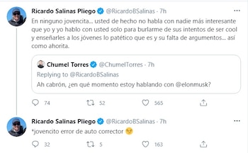 Torres respondió que eran más chistosos los viejitos, a lo que Salinas dijo “Y millonarios también”. Chumel respondió que en qué momento estaba hablando con el dueño de Tesla Elon Musk. “Ah cabrón, ¿en qué momento estoy hablando con @elonmusk?”, dijo el youtuber.