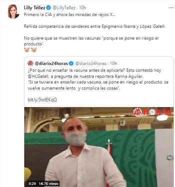 “Primero la CIA y ahora las miradas de rayos X... Reñida competencia de sandeces entre Epigmenio Ibarra y López Gatell: No quiere que se muestren las vacunas “porque se pone en riesgo el producto”, mencionó la exmorenista.