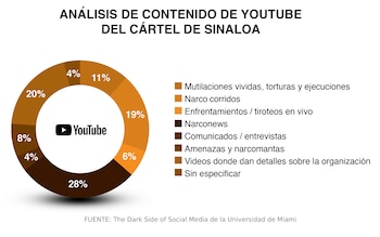 En esta plataforma, además, publican “narcocorridos”, los cuales han jugado un papel clave en lo que se conoce como la narcocultura mexicana y representa el 19%, seguido de 11% del contenido que está enfocado en torturas, asesinatos y ejecuciones, generalmente con el objetivo de intimidar a sus rivales. Las amenazas a otros cárteles se presentan en un 8%, las batallas y tiroteos en vivo en un 6% y un último 4% responde a los esfuerzos y entrevistas hechas por el mismo cártel.