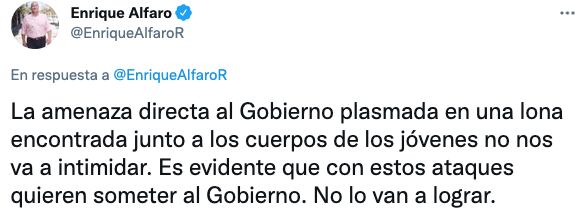 Este lunes, en una conferencia de prensa, el gobernador de Jalisco, Enrique Alfaro, aseguró que ya se realizan las indagatorias para dar con el paradero de los asesinos. “Es evidente que con estos ataques quieren someter al gobierno. No lo van a lograr”, especificó a través de su Twitter.