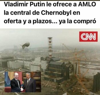 En el meme, se lee el mensaje: Vladimir Putin le ofrece a AMLO la central de Chernobyl en oferta y a plazos... ya la compró. También se ve una imagen en donde se observa la planta de aquella ciudad, ubicada en Ucrania, y a AMLO y Putin, presidente de Rusia, tomados de la mano, en señal de que cerraron un trato.