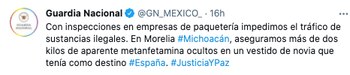 Elementos anti narcóticos de la Guardia Nacional realizaron en inspecciones de rutina en empresas de paquetería, donde lograron interceptar en Morelia, Michoacán, más de dos kilos de aparente metanfetamina ocultos en un vestido de novia que tenía como destino España.