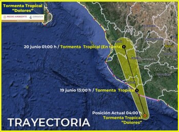 A las 10:00 horas, tiempo del Centro de México, el centro de la tormenta tropical Dolores se localizó en tierra, muy cerca de la Bahía de San Telmo, a 4 kilómetros (km) al noroeste de San Juan Aldama, Michoacán, y a 75 km al sureste de Manzanillo, Colima, con vientos máximos sostenidos de 110 kilómetros por hora (km/h), rachas de 140 km/h y desplazamiento hacia el nor-noroeste a 20 km/h.