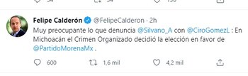 “Muy preocupante lo que denuncia @Silvano_A con @CiroGomezL : En Michoacán el Crimen Organizado decidió la elección en favor de @PartidoMorenaMx”, dijo Calderón Hinojosa.