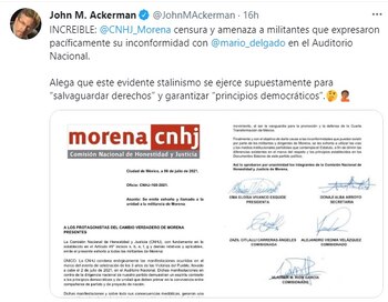 “INCREIBLE: @CNHJ_Morena censura y amenaza a militantes que expresaron pacíficamente su inconformidad con @mario_delgado en el Auditorio Nacional”, escribió el académico de la UNAM.