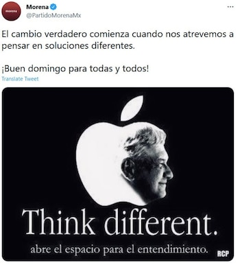 Casi de inmediato, los usuarios de redes sociales arremetieron contra el partido acusándolo de “plagio” de la campaña de la empresa californiana. De hecho, la imagen presentada por Morena es el logo de la manzana con el perfil de López Obrador y es reconocido eslogan de la campaña “Think different” (piensa diferente). Además de que en la parte inferior se colocó la frase: “abre espacio para el entendimiento”.