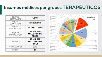 Según su informe, el Instituto de Salud para el Bienestar (INSABI) en alianza con la Oficina de las Naciones Unidas para Servicios de Proyectos (UNOPS por sus siglas en inglés), se lograron comprar 1,840 claves de medicamentos, lo que corresponde a 217,329,862 piezas, de las cuales ya se entregaron 26.2 millones.