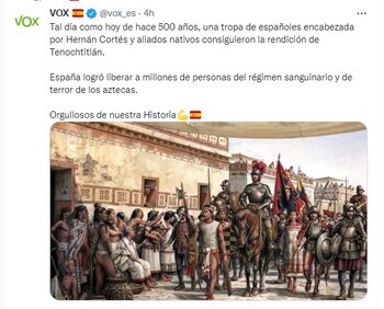 “Tal día como hoy de hace 500 años, una tropa de españoles encabezada por Hernán Cortés y aliados nativos consiguieron la rendición de Tenochtitlán. España logró liberar a millones de personas del régimen sanguinario y de terror de los aztecas. Orgullosos de nuestra Historia”, posteó el partido en sus redes sociales.