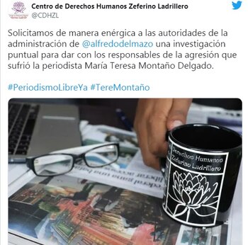 “Solicitamos de manera enérgica a las autoridades de la administración de @alfredodelmazo una investigación puntual para dar con los responsables de la agresión que sufrió la periodista María Teresa Montaño Delgado. #PeriodismoLibreYa #TereMontaño”, fue el mensaje del organismo en su cuenta de Twitter.