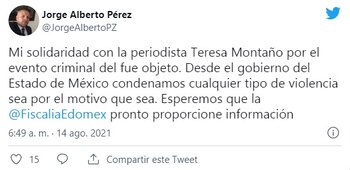 “Mi solidaridad con la periodista Teresa Montaño por el evento criminal del que fue objeto. Desde el gobierno del Estado de México condenamos cualquier tipo de violencia sea por el motivo que sea. Esperemos que la @FiscaliaEdomex pronto proporcione información”, tuiteó Pérez.