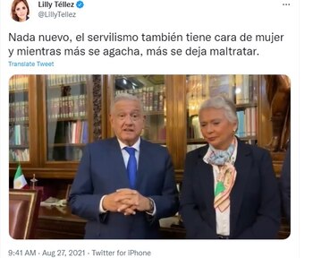 Por medio de su cuenta de Twitter, Téllez posteó una fotografía del momento en que se reunieron AMLO y Sánchez Cordero para dar a conocer la noticia de que ya no estaría al frente de la Segob, y dijo que el servilismo también tenía cara de mujer.