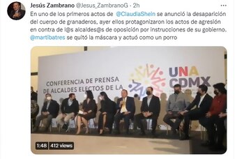 “En uno de los primeros actos de @ClaudiaShein se anunció la desaparición del cuerpo de granaderos, ayer ellos protagonizaron los actos de agresión en contra de l@s alcaldes@s de oposición por instrucciones de su gobierno. @martibatres se quitó la máscara y actuó como un porro”, dijo Zambrano.