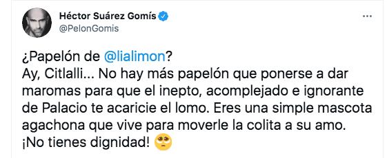 “¿Papelón de @lialimon? Ay, Citlalli... No hay más papelón que ponerse a dar maromas para que el inepto, acomplejado e ignorante de Palacio te acaricie el lomo. Eres una simple mascota agachona que vive para moverle la colita a su amo. ¡No tienes dignidad!”, publicó.