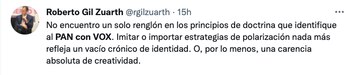 “Hoy, una vez más, el acuerdo con Vox lo demuestra. Y que no vengan con el cuento de que no les hacen caso los senadores, eso está peor. Ojalá cambien ya de dirigencia. Por esas y otras cosas salimos muchos”, escribió en su cuenta de Twitter.