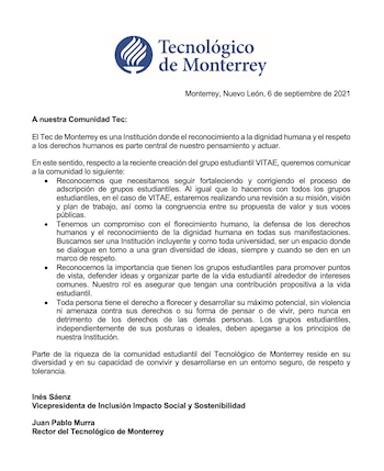 En respuesta a las protestas por redes sociales, el Tec de Monterrey difundió el lunes un comunicado, en el que señala que el respeto a la dignidad y a lo derechos humanos están en el centro de su pensamiento y actuar, por lo que se revisará la creación del grupo.