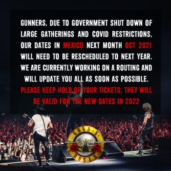 “Gunners, debido al cierre del gobierno para grandes concentraciones (de personas) y las restricciones del Covid, nuestras fechas en México el próximo mes de octubre de 2021 deberán ser reprogramadas para el próximo año. Actualmente estamos trabajando en este tour y los actualizaremos lo antes posible. Por favor, conserve sus entradas, estas serán válidas para las nuevas fechas en 2022”, informaron.