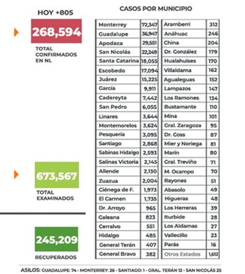 Respecto a las defunciones, informó Manuel de la O Cavazos, secretario de Salud estatal, en las últimas 24 horas se agregaron 39, con las cuales se llega en Nuevo León a 13 mil 506.