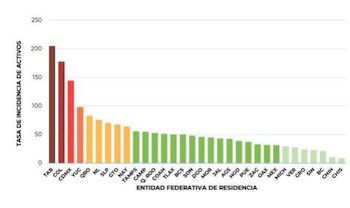 Los casos activos por cada 100,000 habitantes, por entidad federativa posicionan en los primeros 10 lugares a: Tabasco, Colima, Ciudad de México, Yucatán, Querétaro, Nuevo León, San Luis Potosí, Guanajuato, Nayarit y Tamaulipas.