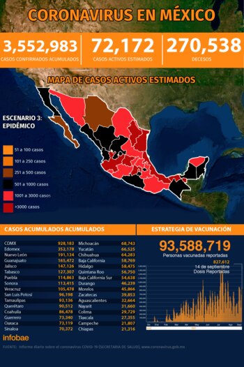 Por otra parte, se reportó que hasta este viernes 17 de septiembre, se han registrado 3,552,983 casos de contagios acumulados de coronavirus (COVID-19). Además, desde el inicio de la epidemia, México ha sufrido 270,538 defunciones por la enfermedad.