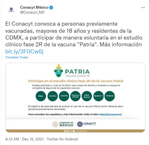 De acuerdo con el anuncio emitido por el Consejo Nacional de Ciencia y Tecnología (Conacyt) el estudio tiene el objetivo de evaluar el uso de la vacuna “Patria” como refuerzo para personas previamente vacunadas.