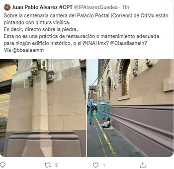 El usuario @JPAlvarezGuedea publicó: “Sobre la centenaria cantera del Palacio Postal (Correos) de CdMx están pintando con pintura vinílica. Es decir, directo sobre la piedra. Esta no es una práctica de restauración o mantenimiento adecuada para ningún edificio histórico, o sí @INAHmx? @Claudiashein” (sic).