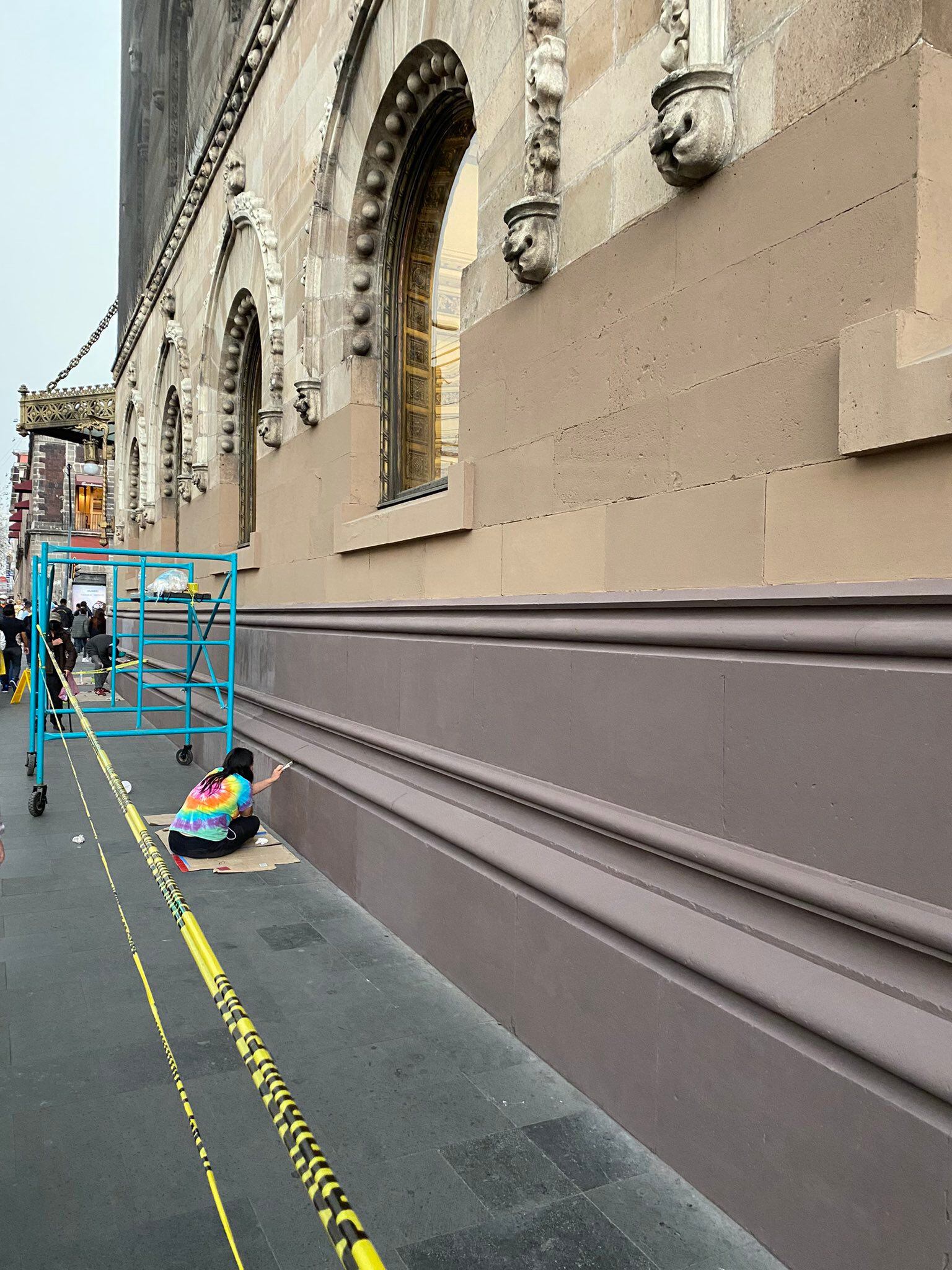 El usuario @JPAlvarezGuedea publicó: “Sobre la centenaria cantera del Palacio Postal (Correos) de CdMx están pintando con pintura vinílica. Es decir, directo sobre la piedra. Esta no es una práctica de restauración o mantenimiento adecuada para ningún edificio histórico, o sí @INAHmx? @Claudiashein” (sic).