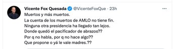 Vicente Fox Quesada, expresidente de México, tundió al presidente, Andrés Manuel López Obrador (AMLO), tras el macabro hallazgo de 16 cuerpos en Zacatecas, entidad que ha sido azotada por la violencia en las últimas semanas.