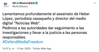 “Lamentamos profundamente el asesinato de Heber López, periodista oaxaqueño y director del medio digital Noticias Web. Pedimos a las autoridades dar seguimiento a las investigaciones y llevar a la justicia a las personas responsables”, escribieron de forma pública en Twitter.