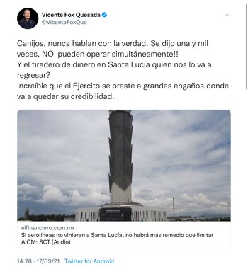 El expresidente, Vicente Fox Quesada, expresó a través de sus redes sociales, su descontento después de que el actual presidente de México, Andrés Manuel López Obrador acusara a sus “adversarios” de difundir una campaña de desprestigio sobre el Aeropuerto Internacional Felipe Ángeles (AIFA).